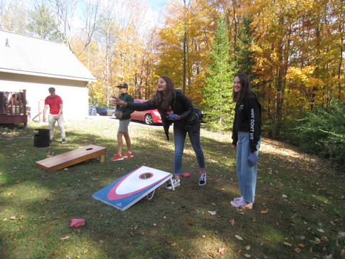 Anschließend kamen alle Apfelpflücker zu dem Haus von Barb und Dave Miceli. Dort kümmerten sich Frau Stegemann und Herr Köhler um den Grill und bereiteten lecker Burger und Hot Dogs zu. Währenddessen wurden ein paar der Äpfel sofort verarbeitet. Viele fleißige Helfer schälten und schnitten Äpfel, rührten Teig oder krümelten Streusel. Am Ende standen Apple Crumble und Apfelküchlein als Dessert auf dem Tisch. Und dieser war schnell von den vielen Leuten verputzt, die im Garten Frisbee, Wikinger Schach, Lacrose oder Wurfsäckchen Spiele spielten. Gegen 3 Uhr wurde nach und nach jeder abgeholt und die Gruppe löste sich glücklich und dankbar für so einen schönen Tag auf.